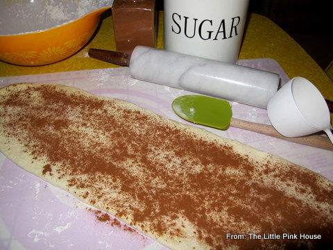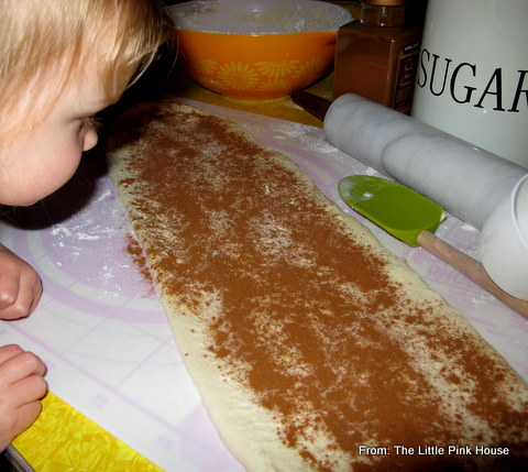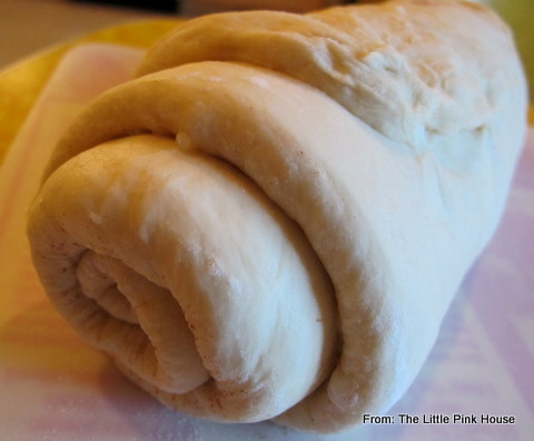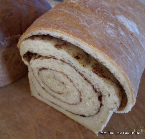 For cinnamon swirl bread: Roll out ball of dough into a long rectangle. The longer the rectangle, the more swirls there will be in the loaf. Spread with butter, powder with a bit of sugar, and sprinkle liberally with cinnamon. Roll up the rectangle of dough, pinching and bringing the ends under to form a loaf.