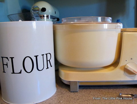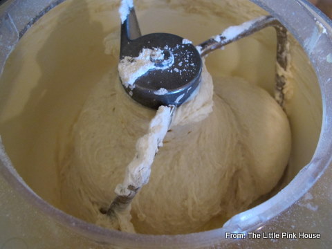 Mix well. Add approximately 2 c. additional white flour, until the dough pulls away from the side of the mixing bowl, forming an elastic ball around the center of the mixer. Knead by hand or mixer for 10 minutes, adding additional flour only as needed (it’s easy to get too much flour in this recipe).